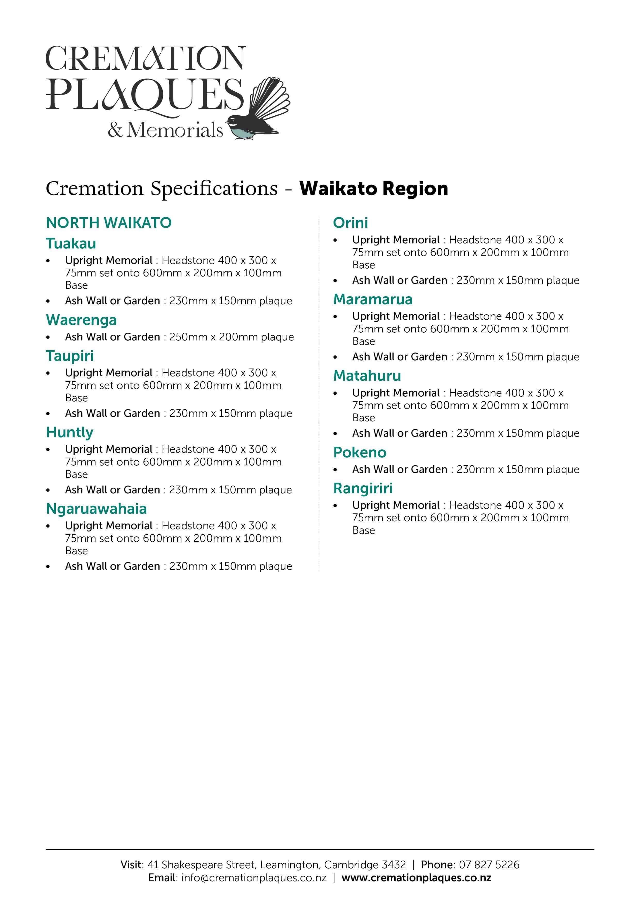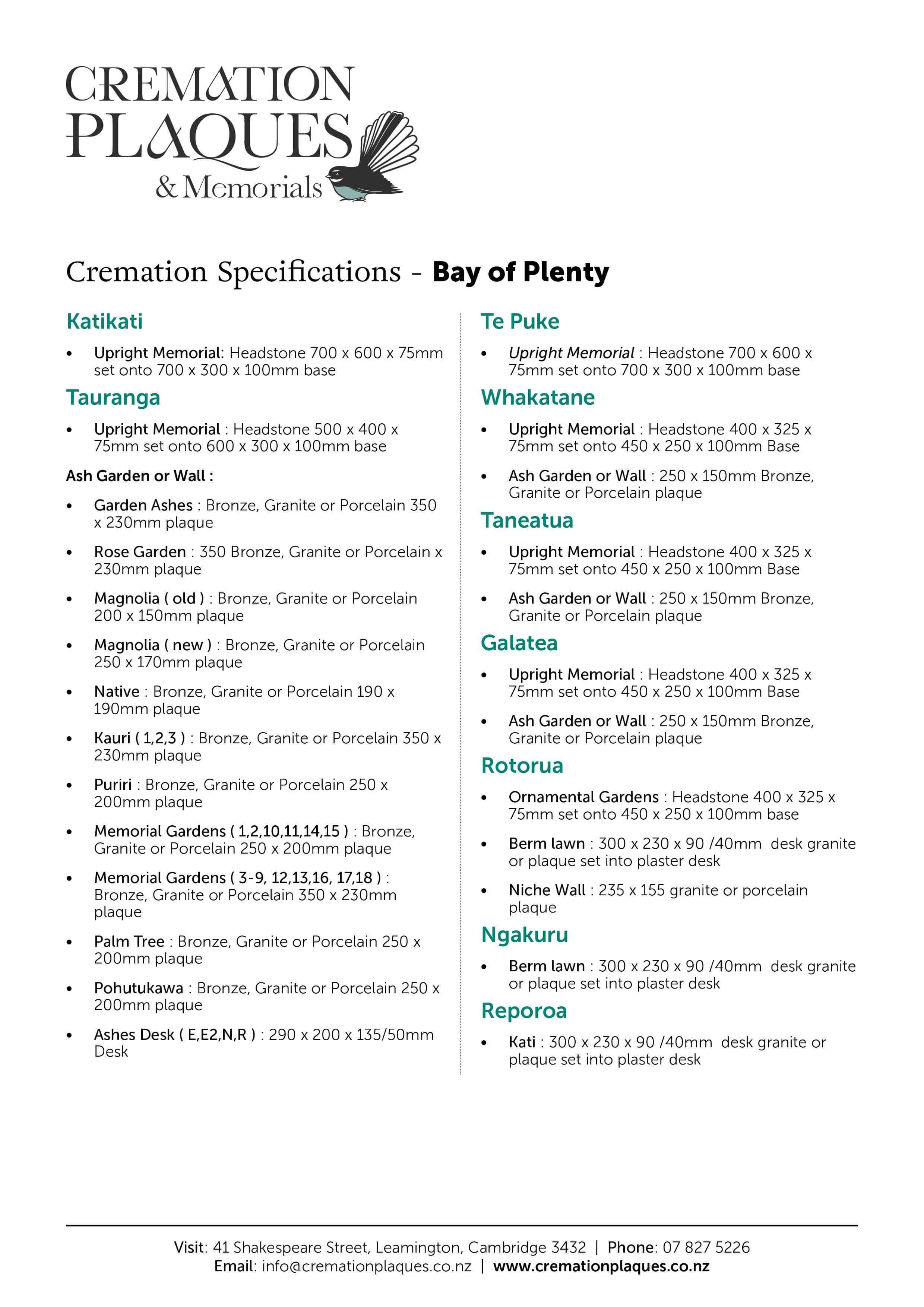 Visit: 41 Shakespeare Street, Leamington, Cambridge 3432Phone: 07 827 5226Email: info@cremationplaques.co.nzOpen: Monday to Friday 9am-5pm